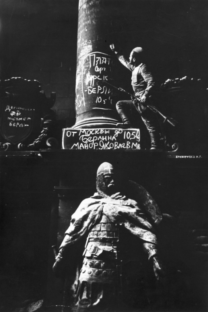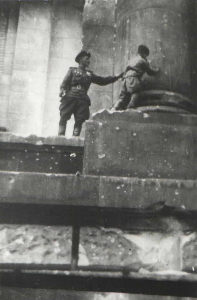 Михаил Егоров и Мелитон Кантария выходят со знаменем на крышу Рейхстага. Хотя это было не первое установленное на Рейхстаге красное знамя, но именно его считают Знаменем Победы.