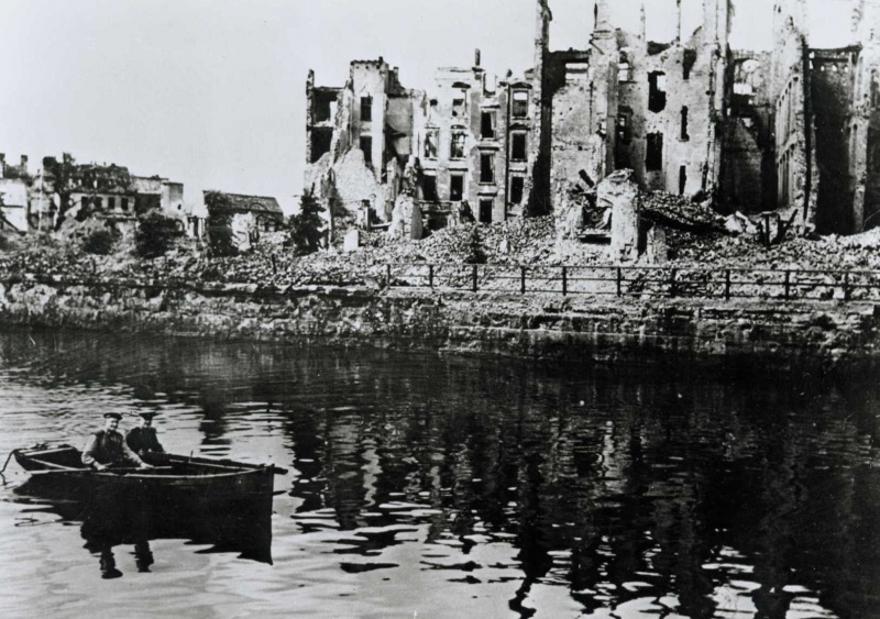 Советские офицеры плывут в лодке вдоль разрушенной набережной в Берлине.