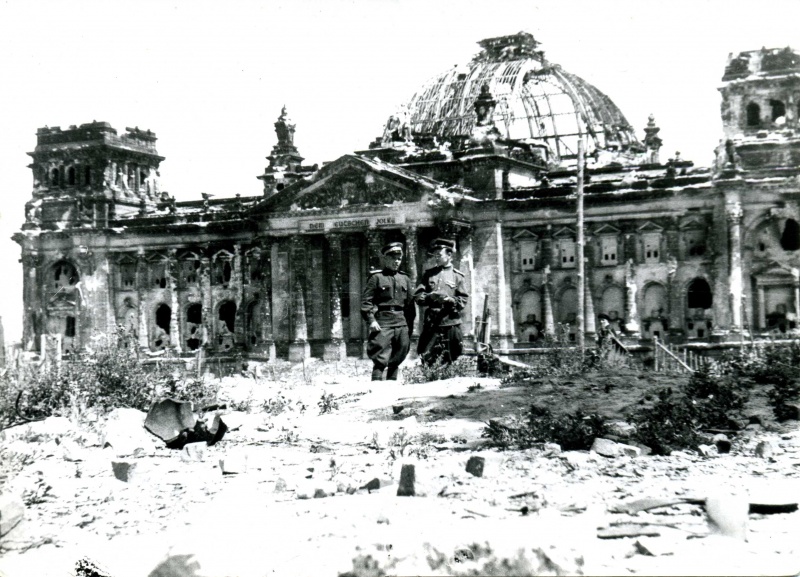 Двое советских офицеров на площади перед зданием Рейхстага.