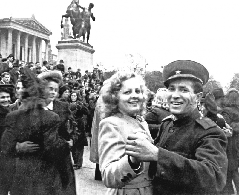 Советский офицер танцует с австрийской девушкой на площади Карл-Реннер-Ринг в Вене.
