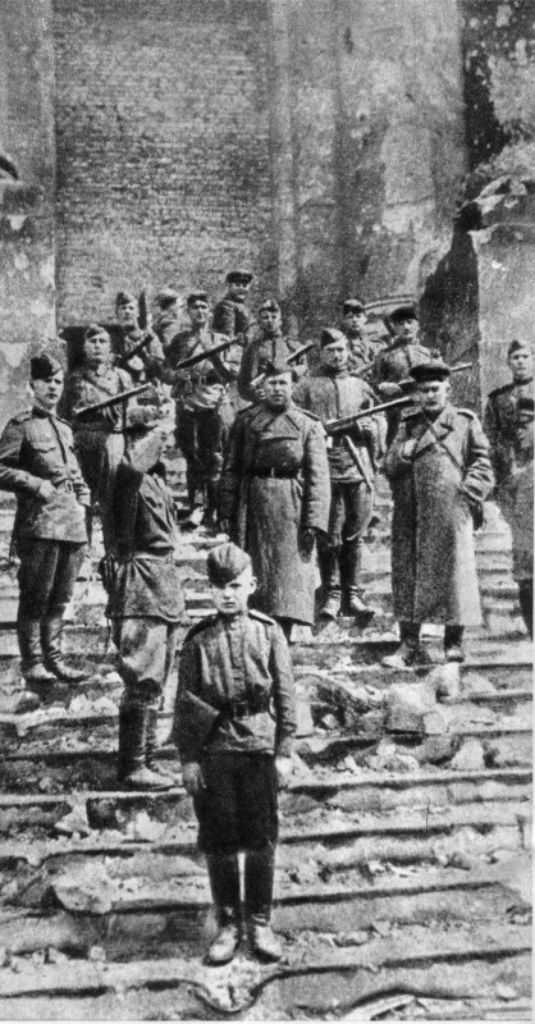 Советские фотожурналисты и кинооператоры у здания Рейхстага. Слева на право, первый ряд: Г. Самсонов, А. Морозов, Ф. Кислов, Л. Железнов, И. Шагин, О. Кнорринг; второй ряд: С. Альперин, А. Капустянский, Г. Петрусов, Р. Кармен; третий ряд: А. Архипов, М. Редькин.