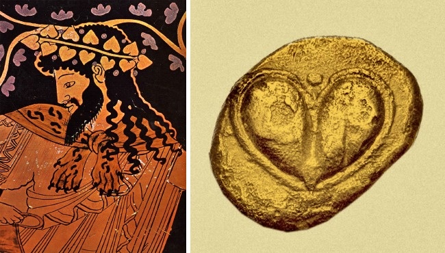 Также есть версия, что данный знак - это форма листика плюща. На вазе у греков он обычно изображался вместе с Дионисом - богом виноделия, покровителем страсти.