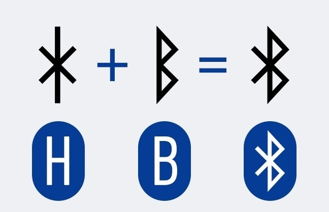 Технология Bluetooth (от англ. "синий зуб") предназначена для объединения нескольких устройств в одну сеть. А знак технологии является сочетанием двух скандинавских рун: "хагал" или "хагалаз" (Hagall) - аналог латинской H, и "беркана" (Berkana) - латинская B, что соответствует первым буквам имени Харальд Блатанд. Кстати, первые устройства, как нетрудно догадаться, были синего цвета и похожими на зуб.