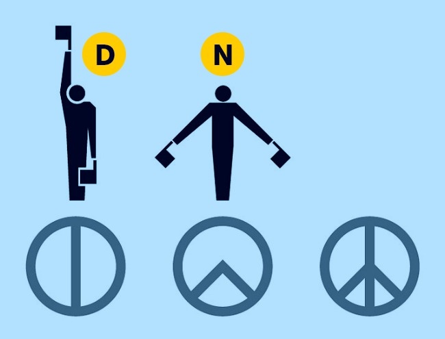 В семафорной азбуке букву N передают, держа два флага в виде перевернутой буквы V, а букву D - один флаг вверх и второй вниз. Эти два сигнала, наложенные друг на друга, образуют форму знака мира.