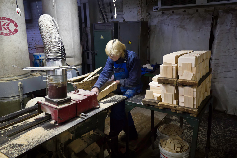 Производство деревянного карандаша чрезвычайно требовательно к качеству материала, в дело идет только чистая прямая древесина. И если для столярных изделий наличие таких дефектов, как, например, сучки, не катастрофично, то карандаш из такого дерева уже не сделать. Поэтому сказать заранее, сколько карандашей получится из одного бруса, очень сложно.