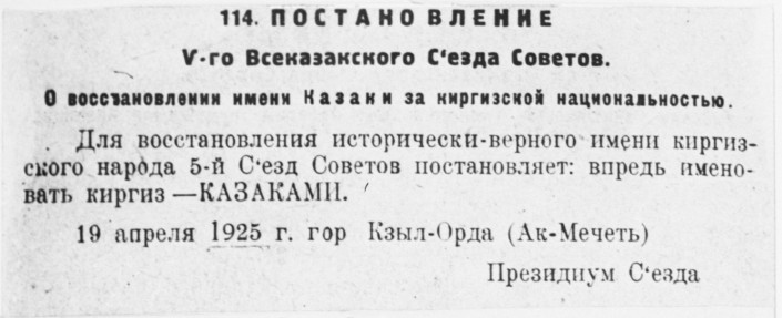 Данный исторический акт был принят на V съезде Советов Киргизской (Казахской) АССР, проходившем 15-19 апреля 1925 года.