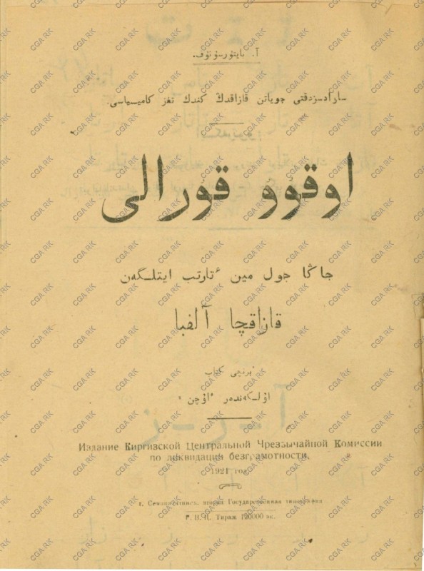 Следующий характерный для того времени документ - учебное пособие Ахмета Байтурсынова "Букварь по ликвидации неграмотности", изданный в мае 1924 года на казахском языке, где на второй строчке авантитула на казахском языке обозначено: "сауатсыздықты жоятын қазақтың орталық тығыз комиссиясы"; на четвертой и пятой строках: "жаңа жол мен тәртіп айтылған қазақша әліппе".