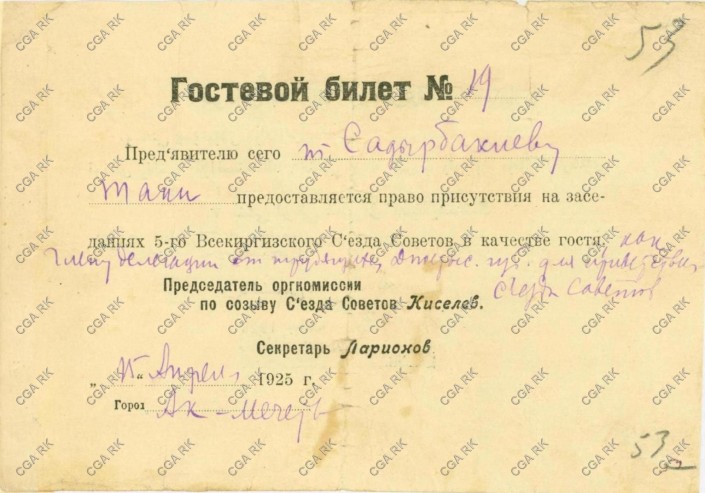 И еще один архивный документ, непосредственно связанный с V съездом Советов Казахской ССР - гостевой билет, дающий право присутствия на заседаниях съезда в качестве гостя.