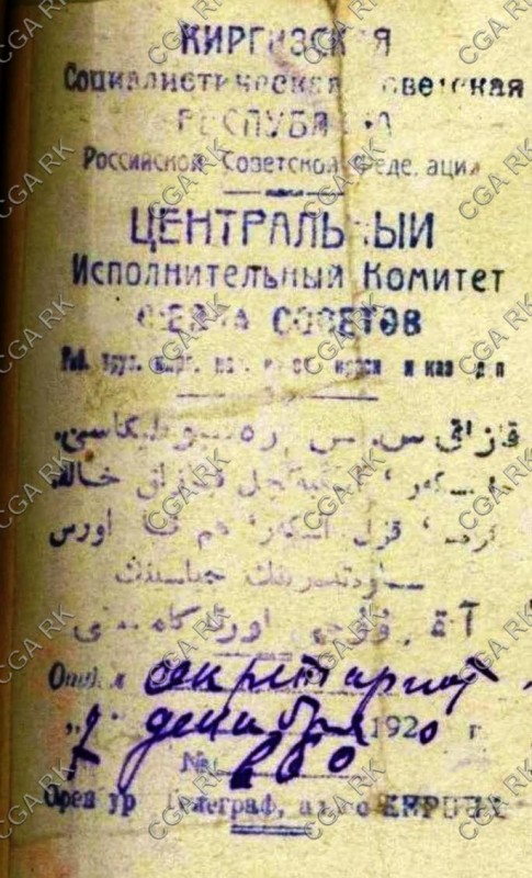 Об этом также свидетельствуют архивные документы. К примеру, возьмем образец углового штампа бланка для писем Киргизского (Казахского) Центрального исполнительного комитета, датируемый 7 декабря 1920 года, где на первой строке, арабским шрифтом написано - "қазақ сс республикасы":