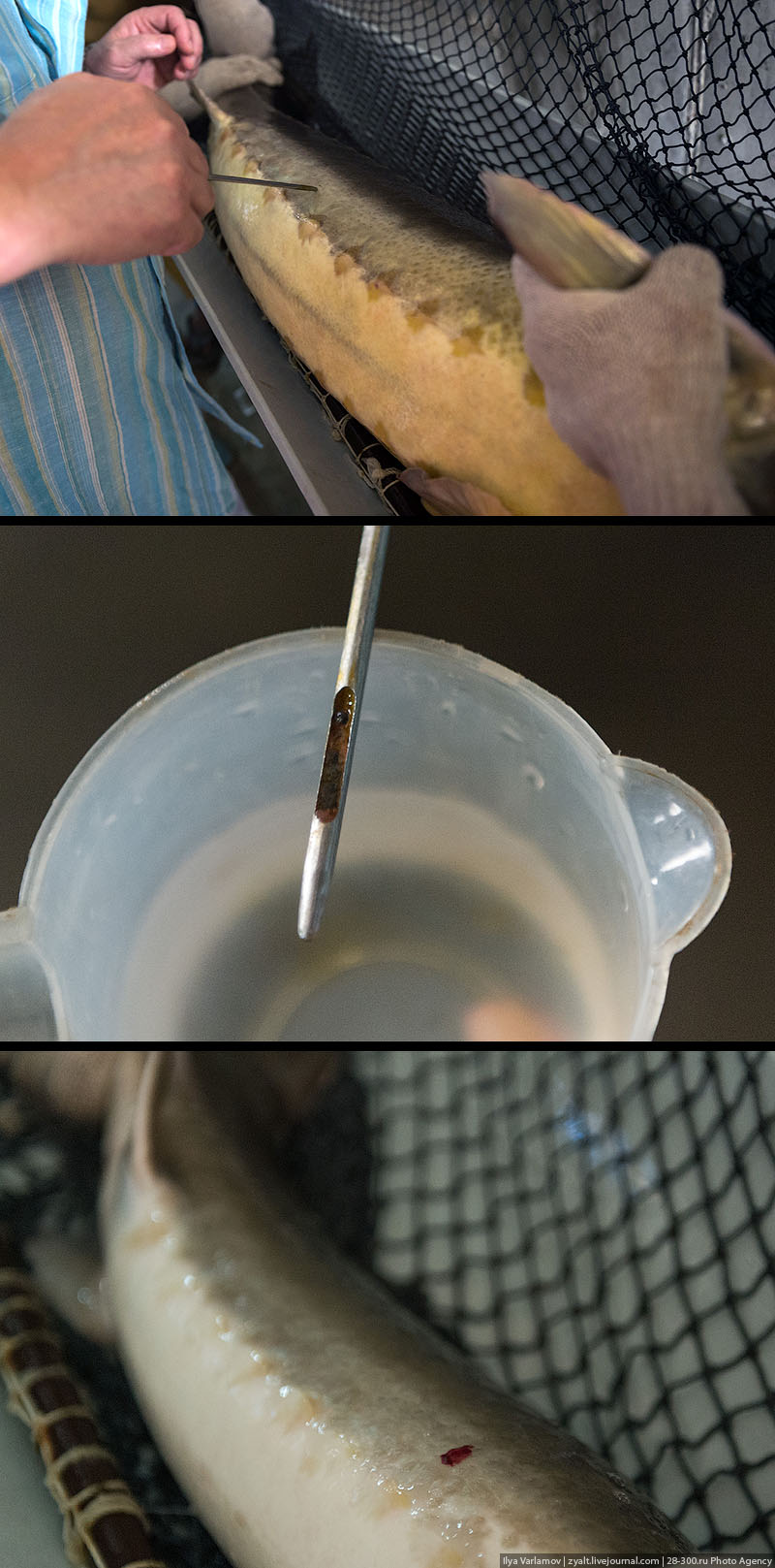 Происходит отбор подходящих самок и самцов осетра. Они помещаются в специальный режим: температура воды на 35-40 дней понижается с 24 градусов до 4-6 (это зимовальный режим), затем повышается до 16 градусов, и в течение примерно 30 часов происходит овуляция. Рыбе вкалывается гипофиз сазана или леща, затем небольшим ножиком ей подрезают брюшину (у рыбы икра находится непосредственно в брюшной полости). С помощью трубки со шприцом на конце у самцов забирают сперму, у самок - икру. Фактически рыбу доят как корову. Икра смешивается со спермой и переводится в лотки.