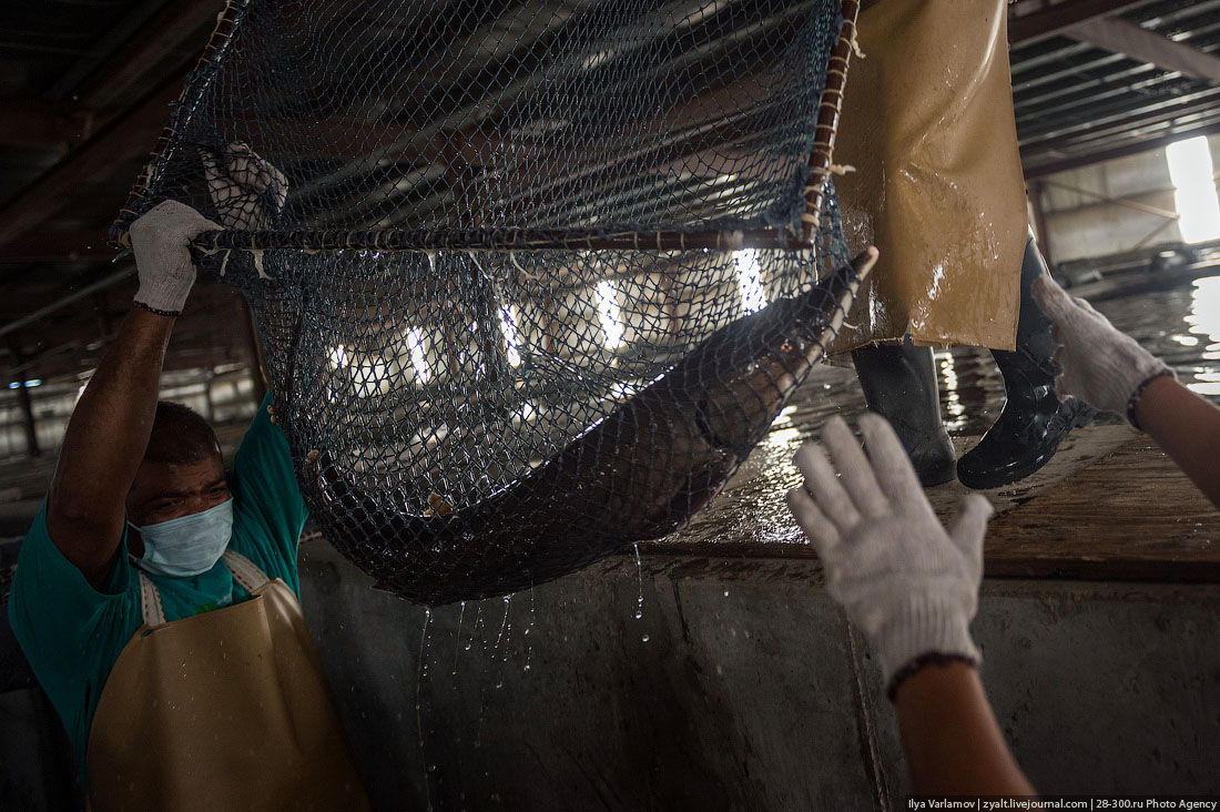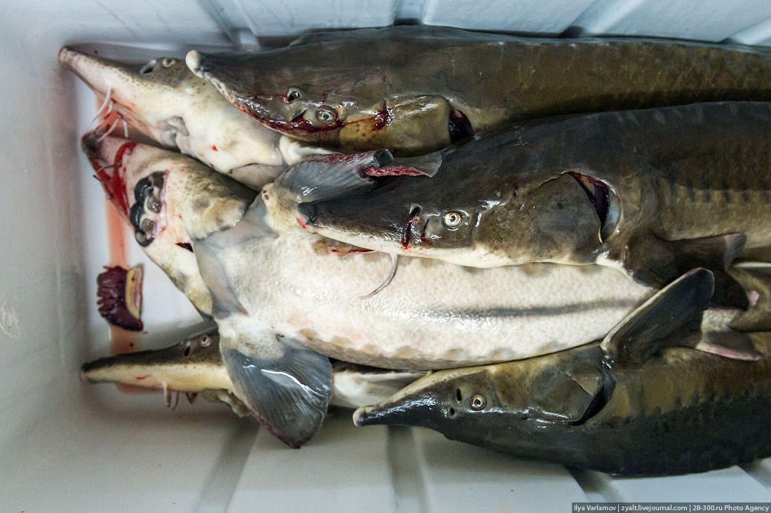 Если рыба предназначена на убой, она получает по голове молотком. Потом удаляются жабры, и осетр подвешивается за хвост, чтобы стекла вся кровь. Затем она уходит в переработку.
