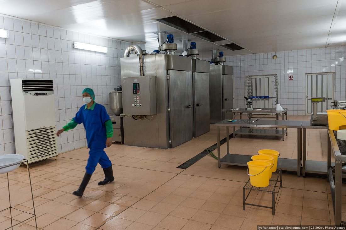 А это уже место, где рыба перерабатывается. Вот большая коптильня. Здесь делают мясо горячего и холодного копчения, балыки, боковники, осетровые сосиски и колбасы.