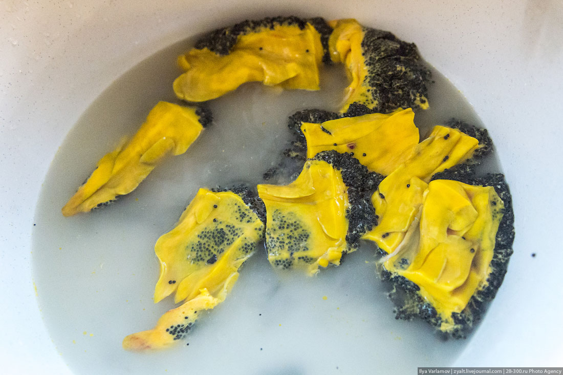 Далее икринки промывают еще три раза. Икра впитывает воду, так что надо делать все очень быстро.