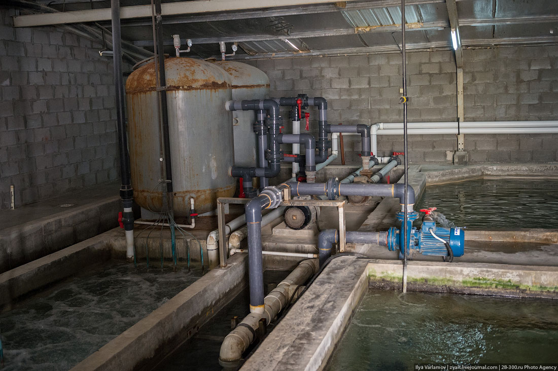1. Бассейны с рыбой, грязная вода с которых уходит в блок очистки. Помимо фекалий рыба выделяет аммиак и углекислый газ через жабры.