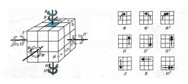 Кубик Рубика представляет собой пластмассовый куб, каждая из шести квадратных граней которого содержит в себе девять мини-квадратов. Каждый поворот грани на рисунке изображен в виде стрелки в квадрате 3Х3. Будем считать, что Ф (фасад) - передняя грань кубика.
