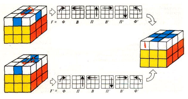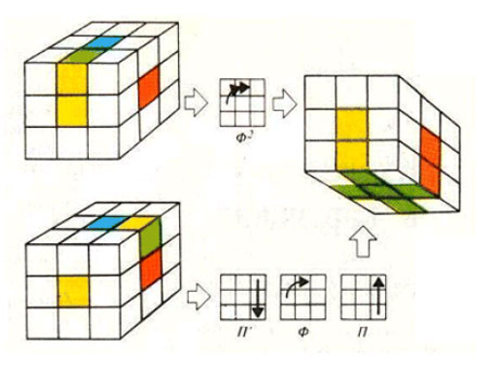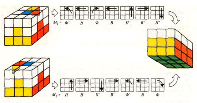 Выбираем реберный кубик без синих граней в верхнем слое и поворачиваем верхнюю грань так, чтобы привести кубик в одно из исходных положений рисунка 3. Далее выполняем повороты, изображенные на рисунке.