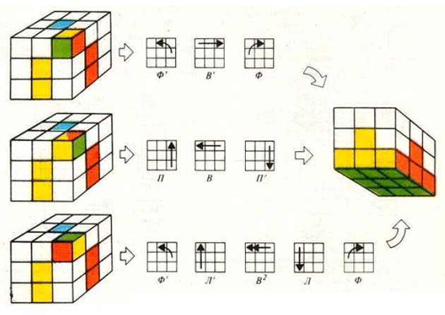 На каждом рисунке представлен исходный вид кубика, затем последовательность поворотов и, наконец, конечное положение кубика в конце данного этапа.