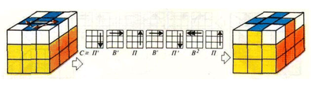 В случае, если один из верхних реберных кубиков уже стоит в конечном положении, а три других надо переставить по часовой стрелке, помещаем кубик в исходное положение и совершаем операции, указанные на рисунке.