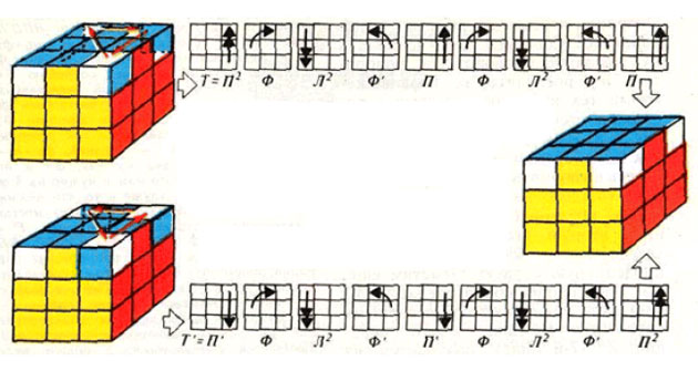 В случае двух иди четырех кубиков располагаем кубик так, чтобы левый верхний угол передней грани был синим, и выполняем операцию Т’ для случая двух кубиков или Т для четырех. После этого выполняем операцию Т, приняв за переднюю соответствующую боковую грань кубика.