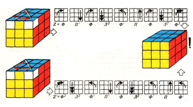 В противном случае следует перевернуть верхнюю грань так, чтобы какие-то два ее реберных кубика встали правильно. Если два других правильно не встанут, то дальше действуем в зависимости от того, являются ли "правильные" кубики соседними или противоположными. В случае соседних - поворачиваем верхнюю грань еще на 90° против часовой стрелки.