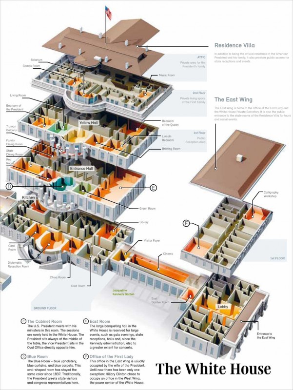 Официальная резиденция президента США - самый известный особняк в мире. Он является укрепленным командным центром с 1700 сотрудниками и домом одного из наиболее могущественных людей в мире.