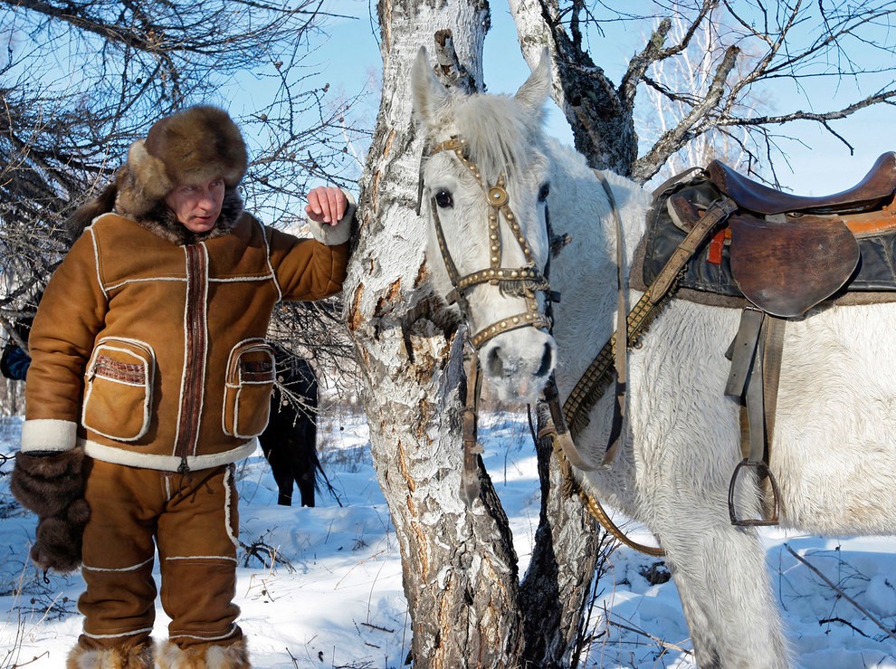 Путин смотрит на коня пронизывающим насквозь взглядом, которому учат только в КГБ.