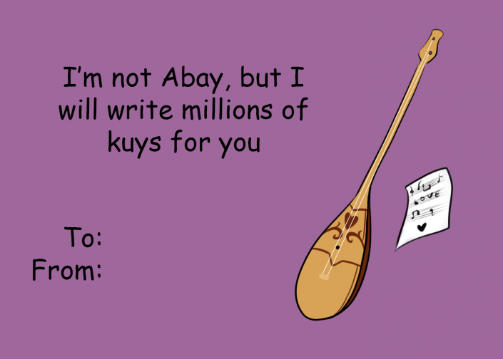 Алуа, 15 лет, автор текста: "Все началось с того, что на собрании ученического самоуправления подняли вопрос о проведении Дня влюбленных Козы-Корпеш и Баян-Сулу. Мы решили организовать в школе почту для поздравлений по этому случаю. Тогда мне в голову пришла идея о создании открыток, так сказать, "казахских валентинок", чтобы заинтересовать как можно больше людей".