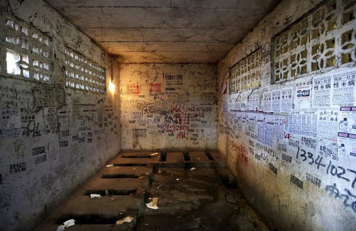 Общественный туалет, обклеенный рекламными объявлениями и агитками, в жилом районе для трудящихся-мигрантов в пригороде Пекина,