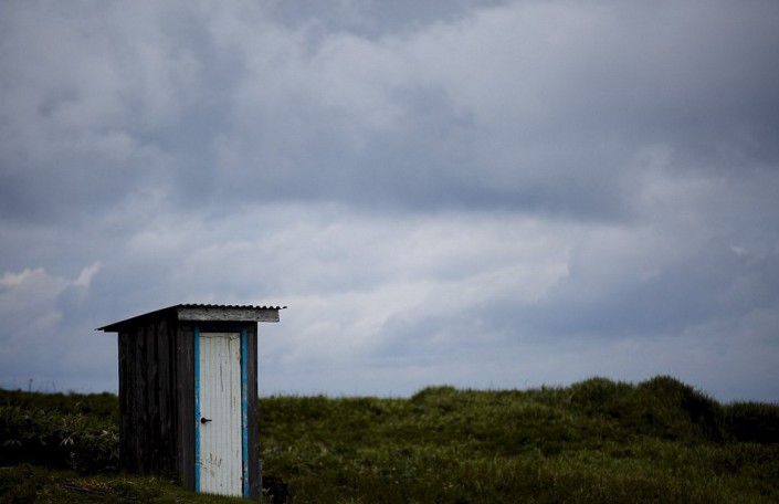 Туалет в поле в Южно-Курильске на острове Кунашир (Россия).