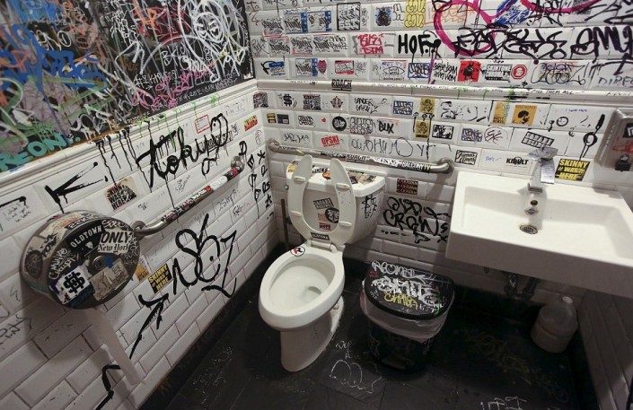 Граффити на стенах в уборной в ресторане в Бруклине (Нью-Йорк, США).
