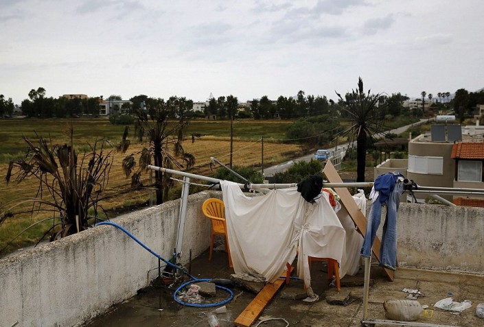 Импровизированная душевая кабина и туалет на крыше отеля для мигрантов на острове Кос (Греция).