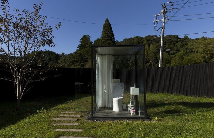 Туалетная кабина со стеклянными стенами на железнодорожной станции в префектуре Тиба (Токио).