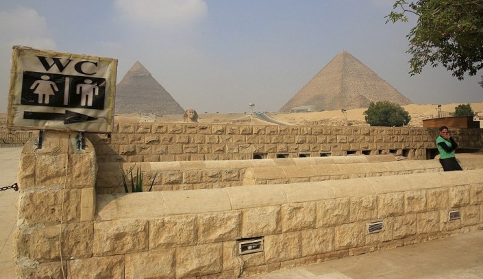Туалет рядом с Большим сфинксом и пирамидой Хеопса в Египете.