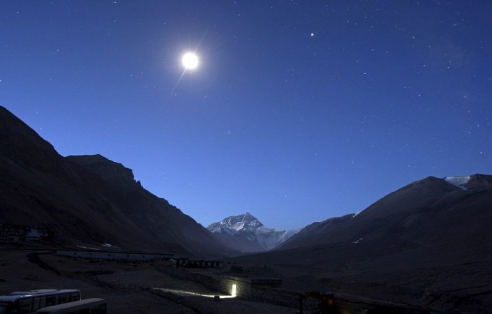 Туалет в Тибете. На дальнем плане - гора Эверест, освещаемая первыми лучами восходящего солнца.