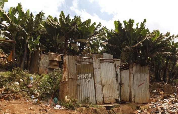Общественный туалет, сооруженный из ржавых металлических листов в трущобах Найроби (Кения).