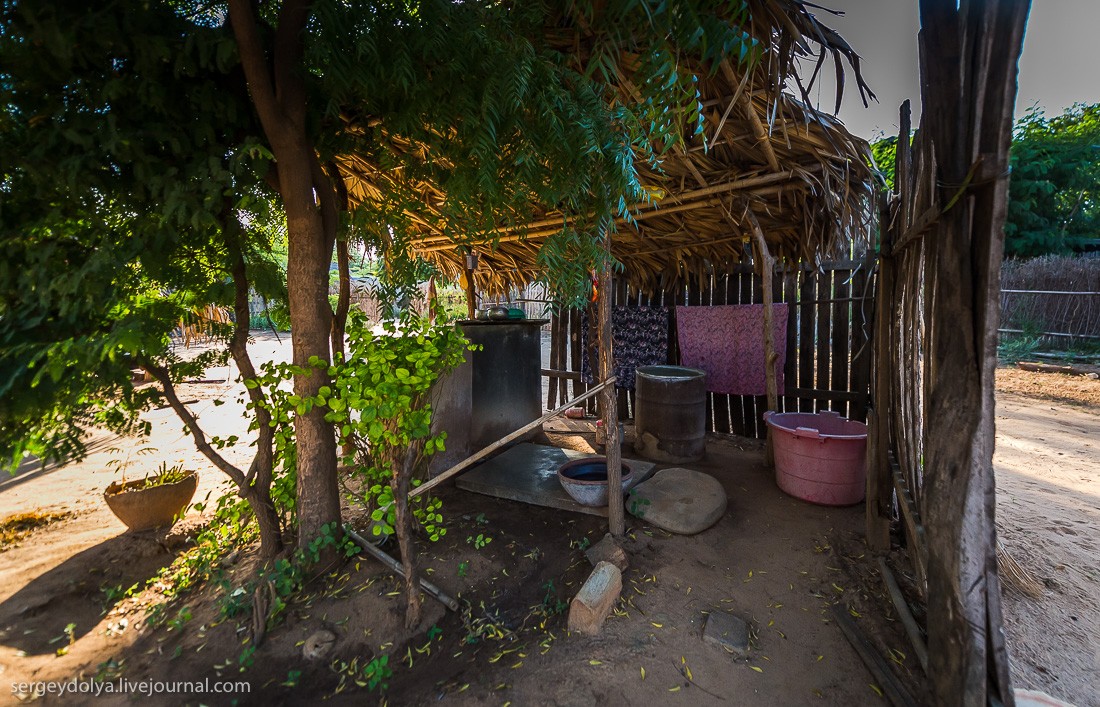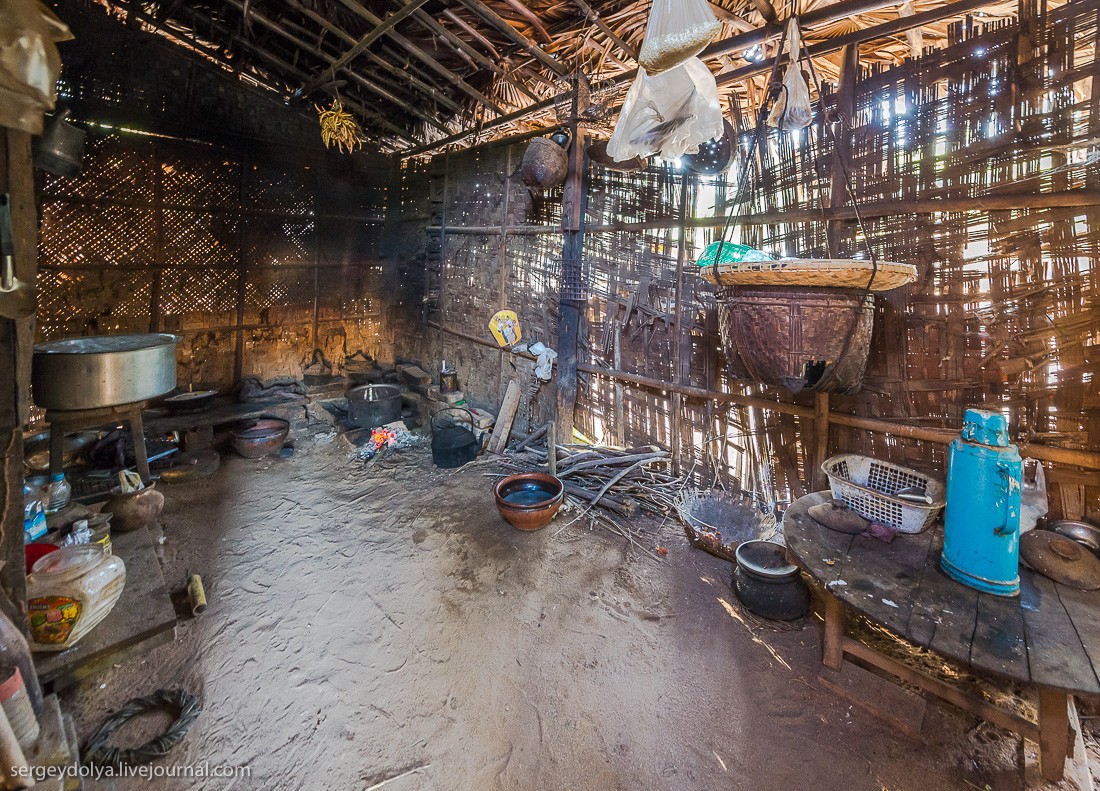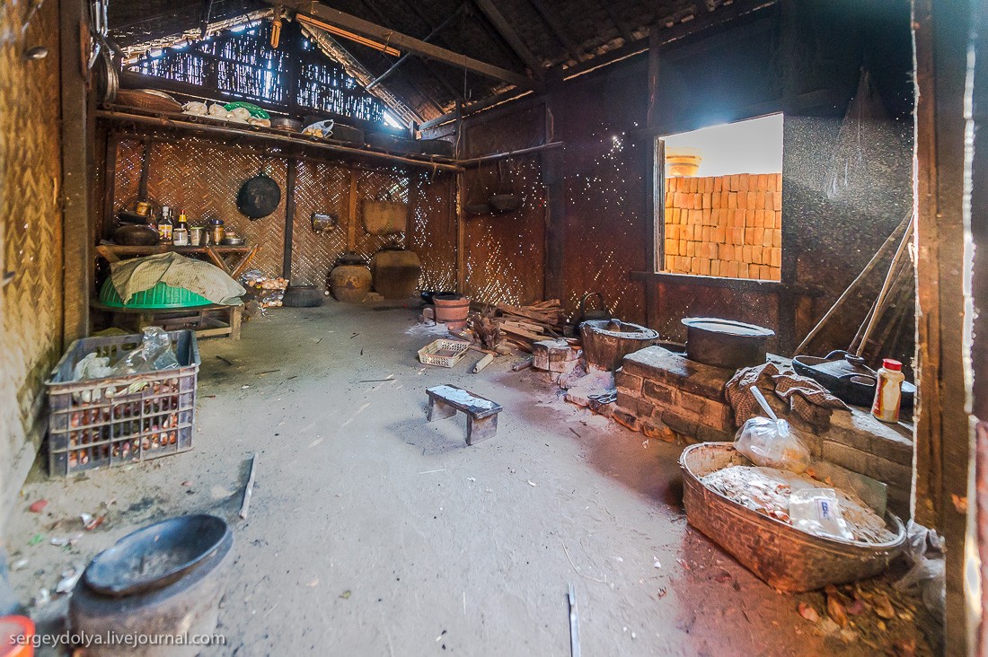 Кухня вынесена в отдельное строение. Здесь есть все, о чем может мечтать бирманская женщина: современная посуда, котелки, дрова и удобные подвесные крючки для корзин.