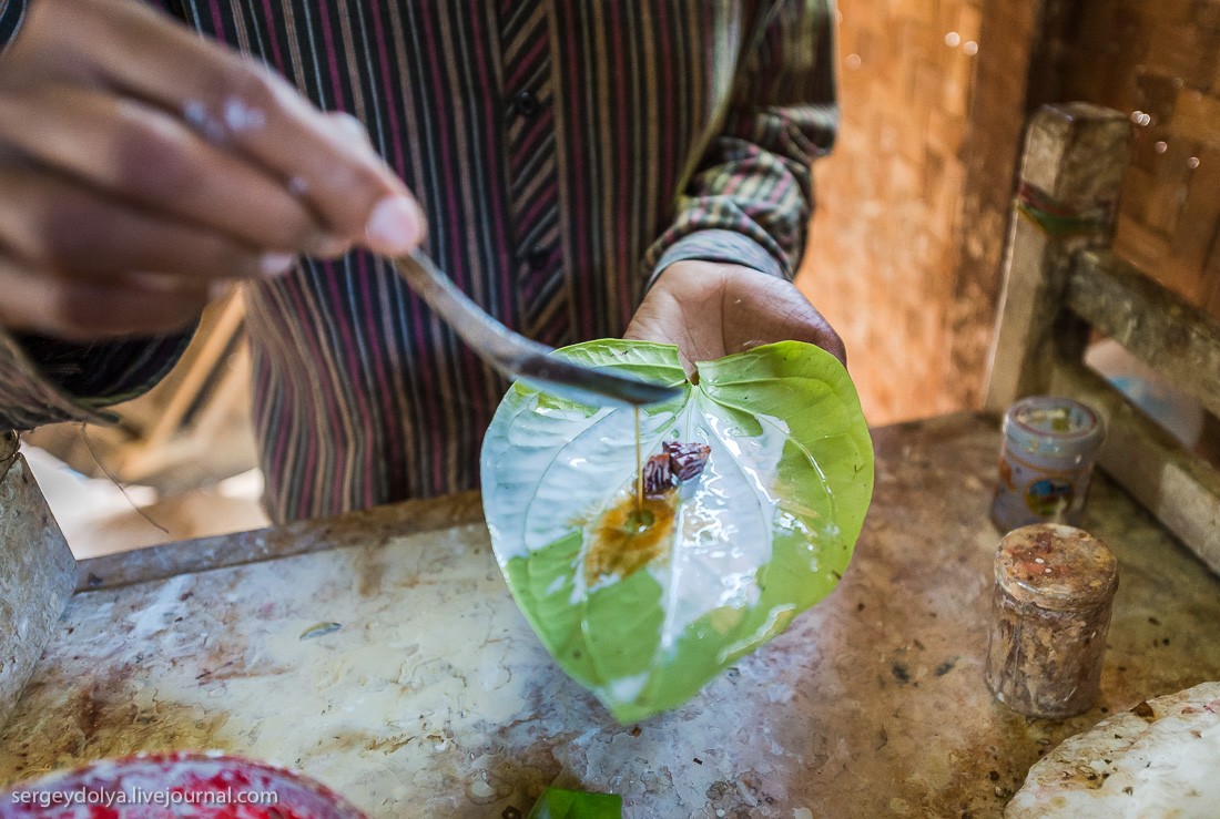 Бетель тут употребляют примерно так же, как в Южной Америке листья коки. Их жуют вместе с гашеной известью, которая позволяет веществам содержимого всосаться в кровь.