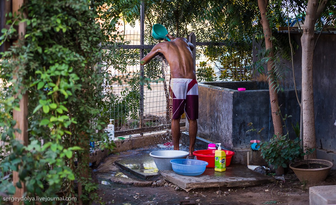В отличие от нашего изогнутого коромысла, бирманцы таскают прямую палку. Видимо, не могут погнуть. Поэтому они придумали две веревки по обе стороны, чтобы было легче поднимать и нести ведра.