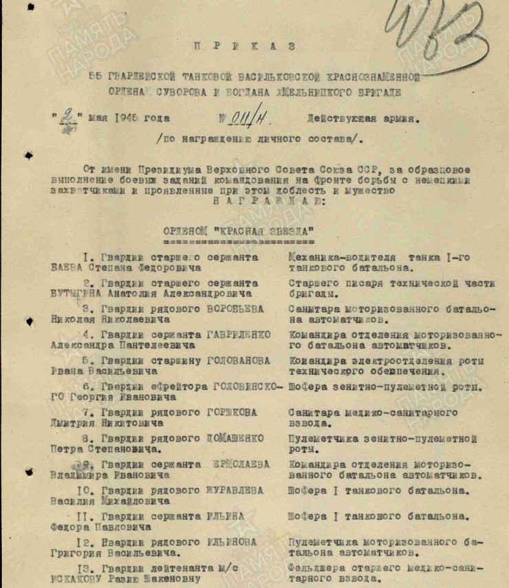 Приказ о награждении Разии Искаковой орденом Красной Звезды. © "Память народа"