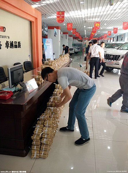 Житель Китая при покупке нового автомобиля стоимостью около 110 тысяч долларов привез в автосалон 660 тысяч монет общим весом в четыре тонны и 20 тысяч мелких купюр. Чтобы перенести деньги в магазин, понадобился целый час и помощь десяти продавцов. В помещении менеджеры сложили монеты в гору высотой более четырех метров, сообщают китайские СМИ.