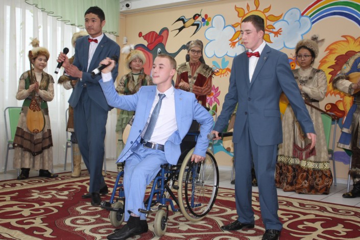 "Шааа-пааа-лааақ! Шапалақ қайда!" - задорно выкрикнул своим зрителям Илья Мугайских - 16-летний парень в инвалидной коляске. У него несколько сложных диагнозов, и он с четырех лет проживает в Центре оказания специальных социальных услуг № 2 (Алматы). Молодой человек обладает невероятно сильным голосом, ну а его манере держаться на сцене позавидуют даже певцы-профессионалы. Вчера Илья выступал с двумя другими ребятами перед особенными детками из своего родного Центра.