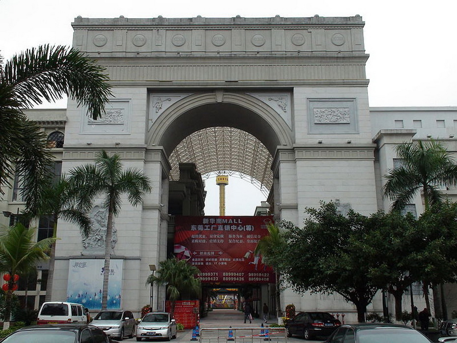 "Триумфальная арка" на входе в торговый центр New South China Mall в городе Дунгуань. New South China Mall - крупнейший торговый центр в мире, однако из-за просчетов в планировании и транспортной труднодоступности за девять лет своего существования он был заполнен лишь на один процент.