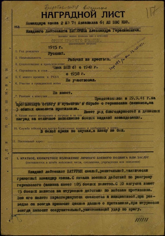 Лучше чувствовал себя больной глаз в темноте, поэтому боевые задания Батурин зачастую выполнял ночью. Часто противник, когда советские войска отдыхали, спускал с воздуха минные постановки в районе Кронштадта. Почти неделю Александр нарушал планы противника. Только за это время он сбил два немецких бомбардировщика.