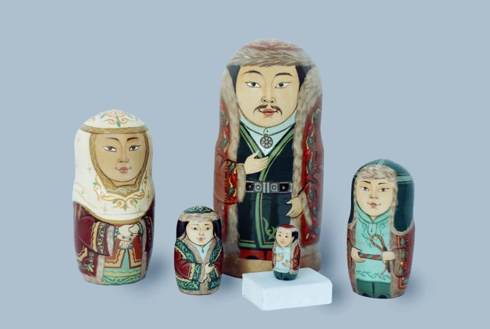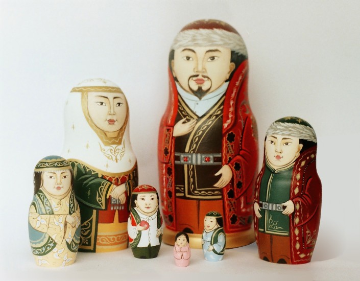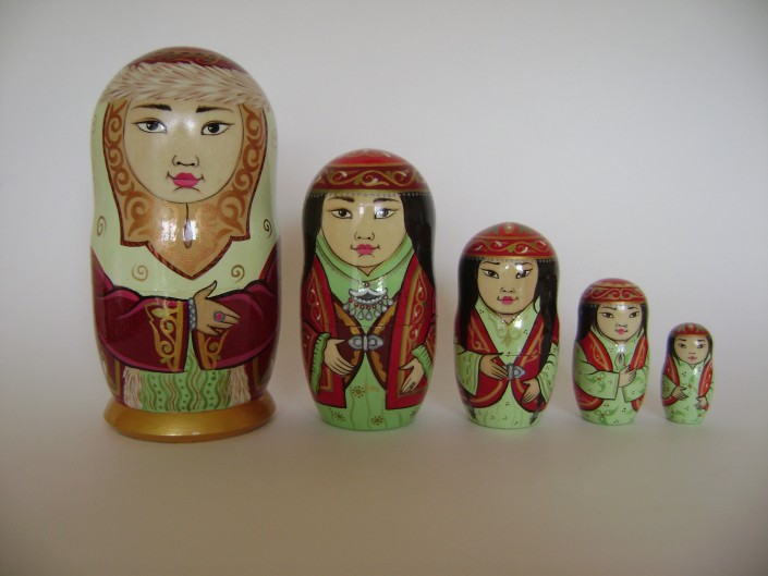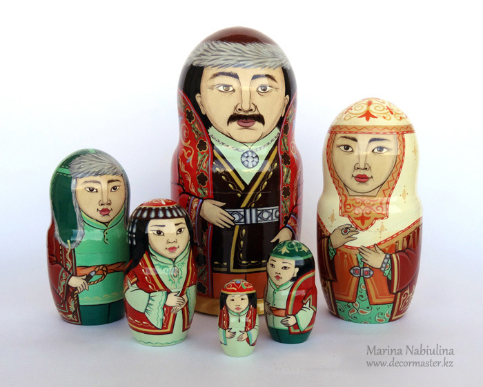 Каждая матрешка автора отличается друг от друга. Например, матрешки-женщины - по возрастам. У казахов - прежде всего по костюмам: самая старшая носит кимешек и шапан, помладше – нарядные шапочки такия, камзолы, жилеты и платья с вышивкой.