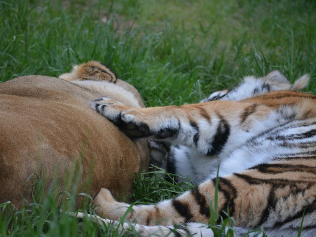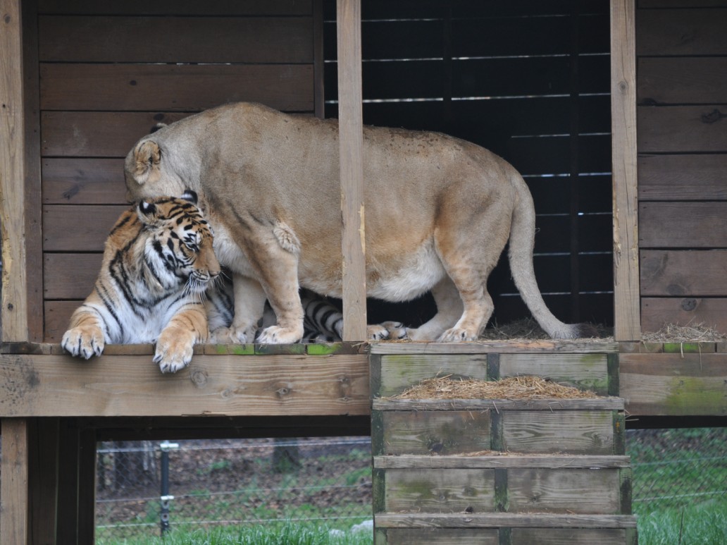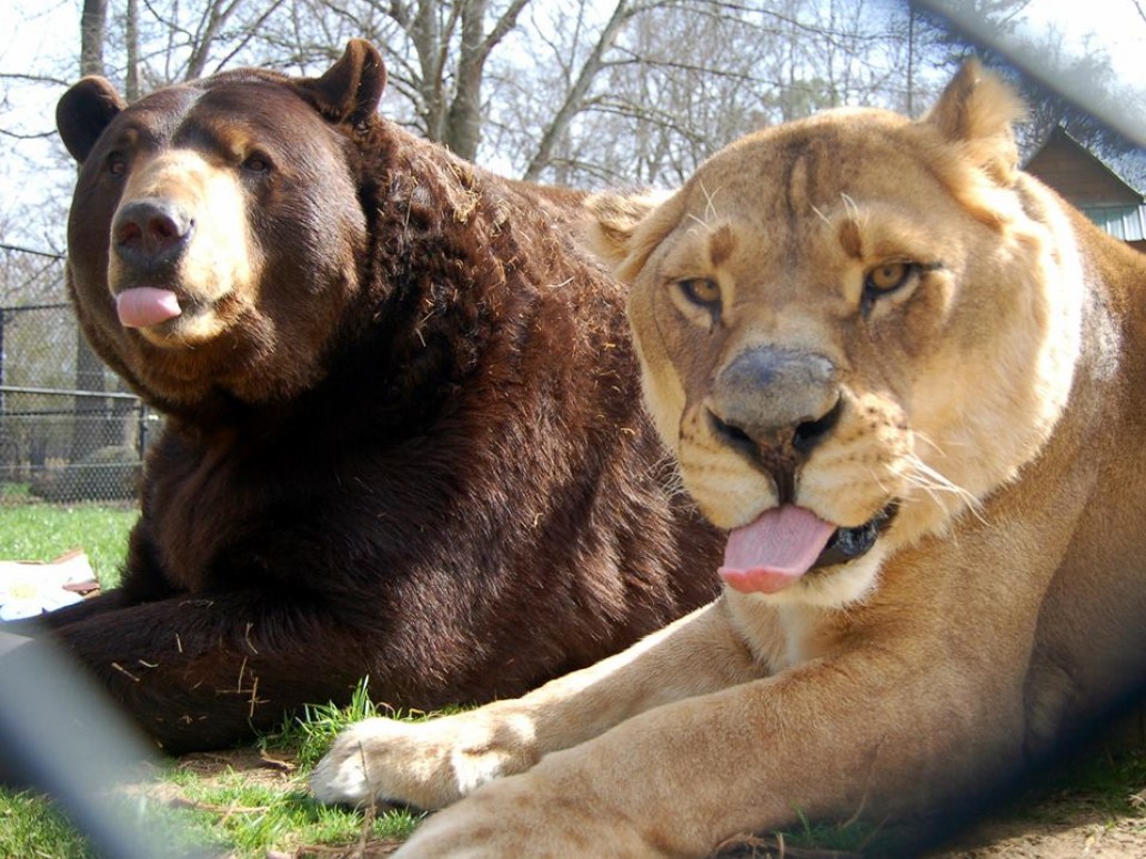 Балу, Лео и Шерхана обнаружили в подвале дома в Атланте, штат Джорджия, во время облавы на притон наркоторговцев в 2001 году. После этого животных, к которым прежние хозяева относились небрежно, поместили под опеку некоммерческой организации помощи диким животным под названием "Ноев ковчег". Когда детенышей вылечили от ран и последствий недоедания, их решили разделить, однако после разлуки все трое вдруг стали вести себя как-то вяло, печально и практически ничего не ели. Тогда их снова поместили в один вольер. Сейчас они живут в вольере площадью чуть больше одного гектара, через который протекает природный ручеек. У них даже есть свой "сельский домик", где лохматое трио любит коротать время. На сегодняшний день - это единственный известный случай, когда три крупных "высших" хищника разных видов живут так близко друг к другу и так дружно. Все трое - самцы и примерно одного возраста. 21 июня "Ноев ковчег" устроил настоящую вечеринку в честь их 13-го дня рождения!