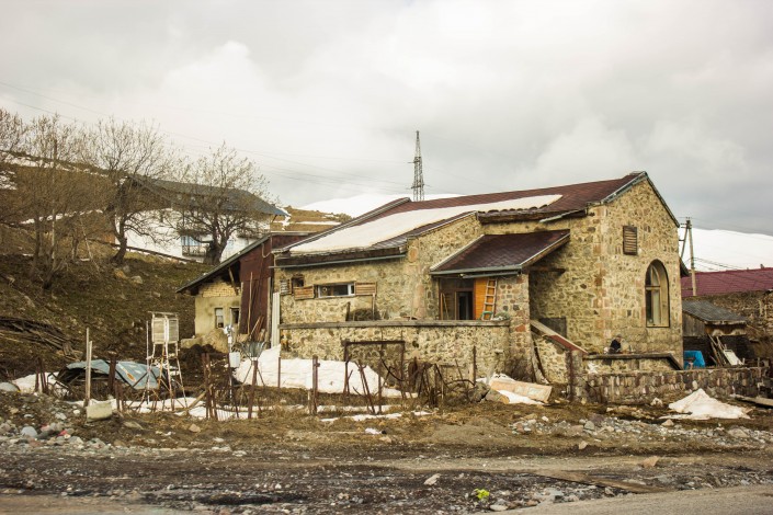 По дороге попадаются такие вот каменные дома. Военно-грузинская дорога описана в нескольких знаменитых произведениях, среди них - "Герой нашего времени" и "Двенадцать стульев".