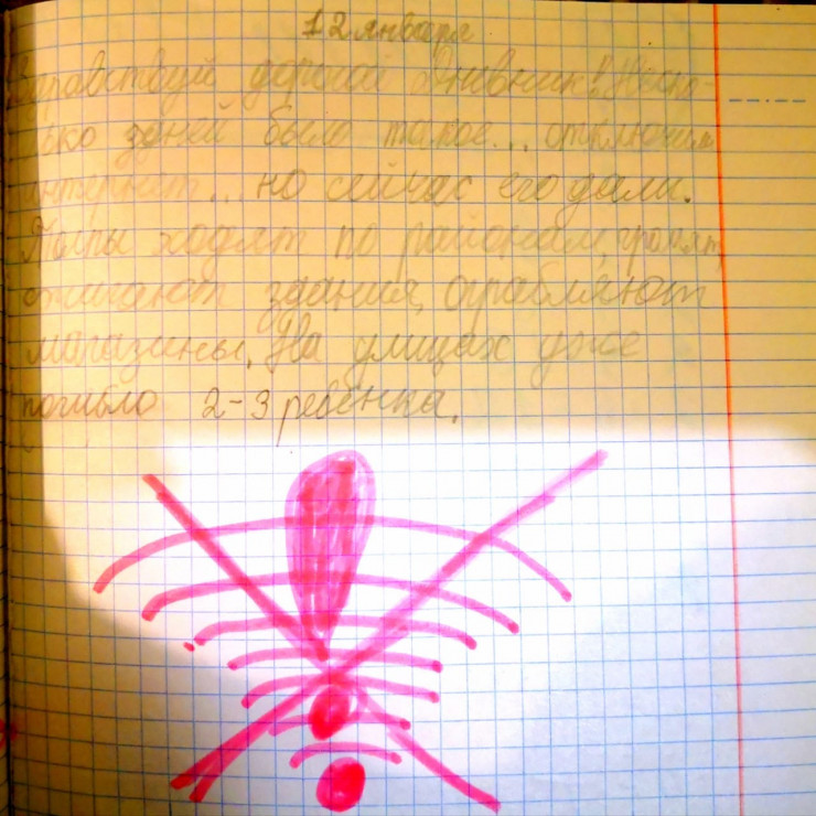 Одна из алматинок поделилась страницей дневника своей девятилетней дочери, который она вела во время режима ЧП. Там девочка описала ситуацию в городе. По словам женщины, ее дочь уже наизусть знает текст предупреждения, который часто транслируют по телевидению, и строгим голосом зачитывает его родителям и бабушке с дедушкой.