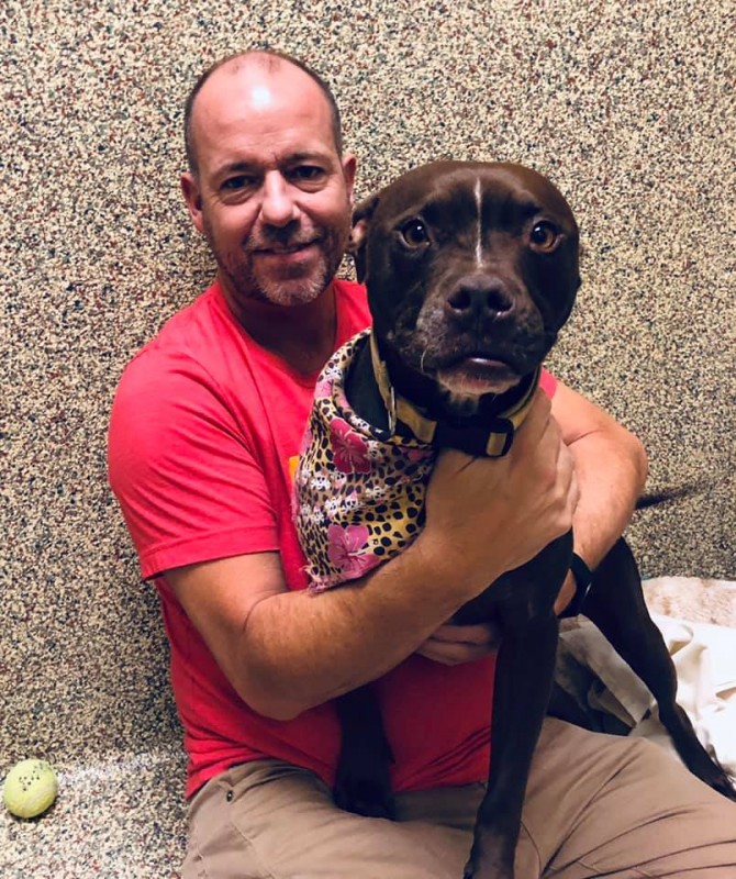 "Ее нашли за мусорным баком. До этого она жила в неблагоприятном районе. Здесь собака получила уход и теперь готова к новой жизни", - говорит мужчина.
