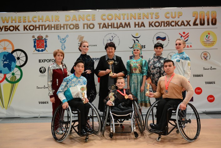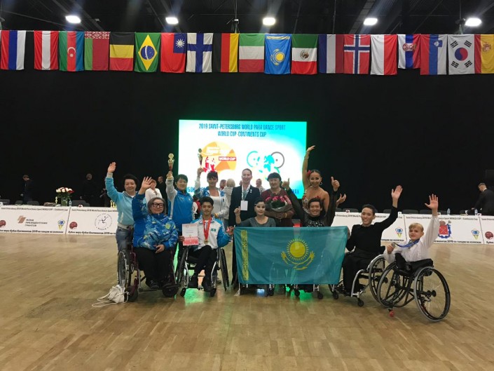 На международных соревнованиях Кубок мира - Кубок Континентов по танцам на колясках. Второй слева Алексей Журавлев, в центре глава Федерации современного и спортивного танца Алия Тусупбекова. Фото © Урджарский ДПМСУ