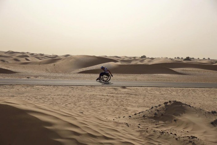 Весь путь Арон преодолел за 21 день на усовершенствованной инвалидной коляске, к которой, в частности, были приделаны лыжи для удобства передвижения по снегу.